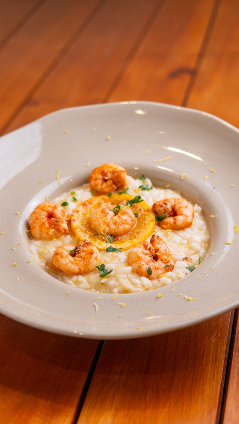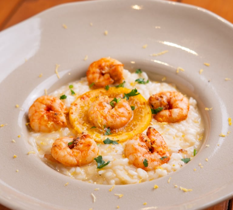 Risoto de limão-siciliano com camarões grelhados, finalizado com redução de aceto balsâmico.