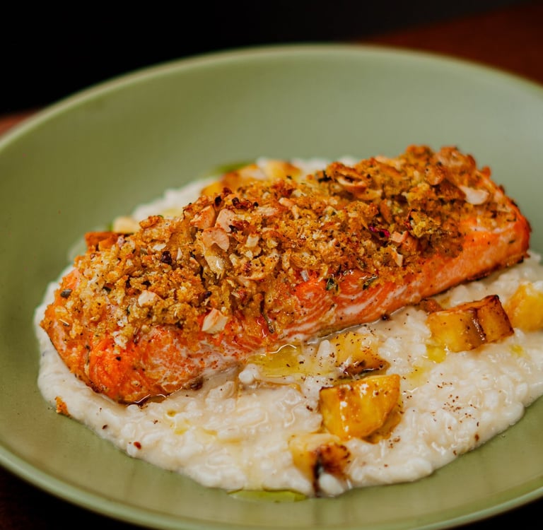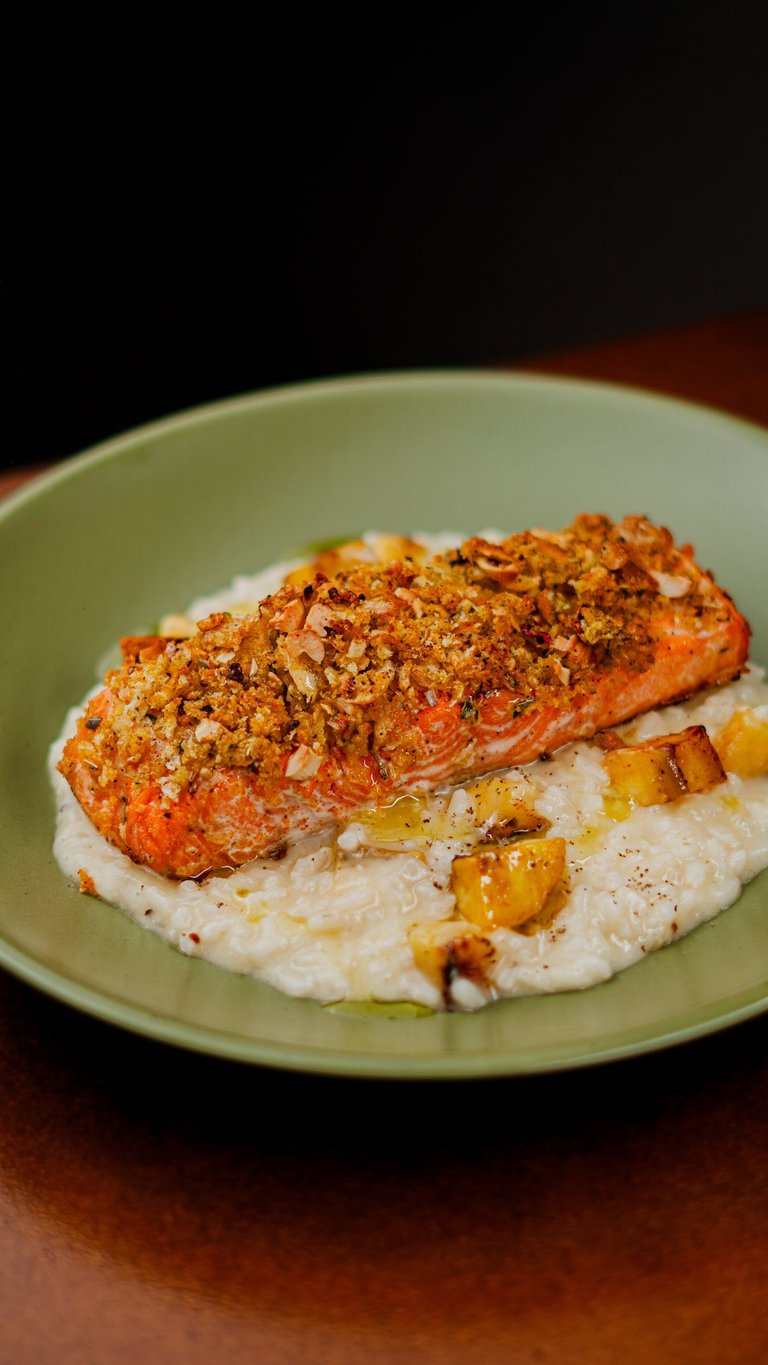 Aveludado risoto de banana-da-terra e alho-poró, acompanhado de salmão ao forno c/crosta de castanha de caju.