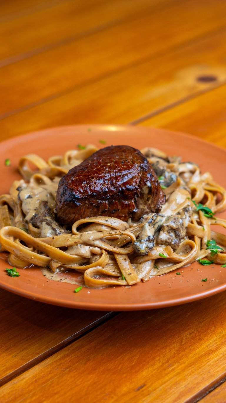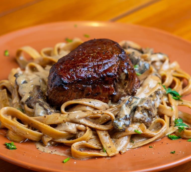Massa tagliatelle, molho cremoso c/ funghi, acompanhado de um suculento filé mignon alto.