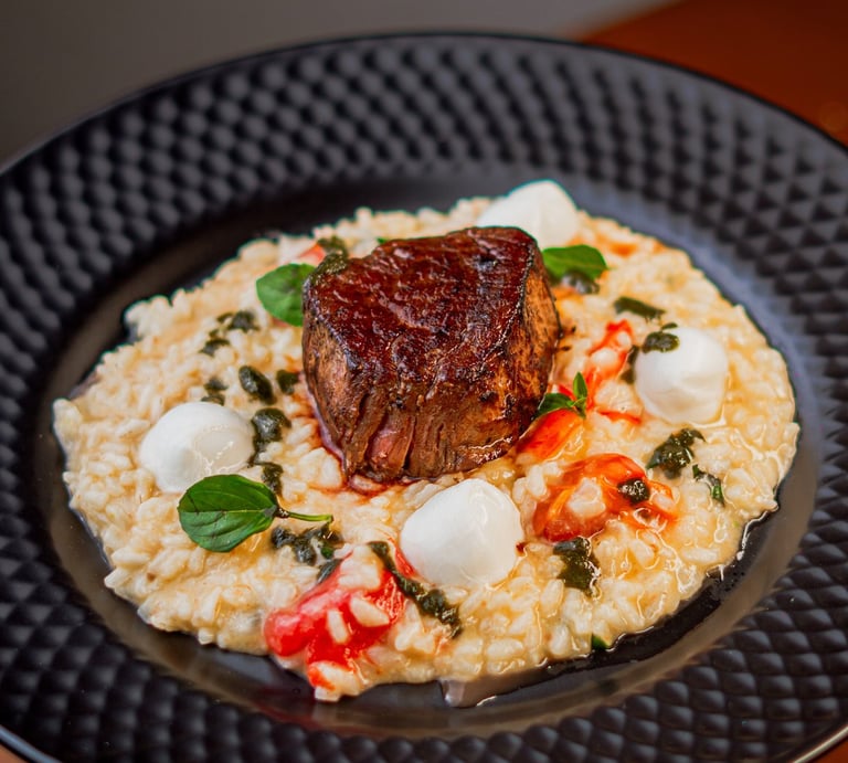 Arroz arbóreo, tomates confit, pesto de manjericão e mussarela de búfala. Servido com medalhão de filé mignon.