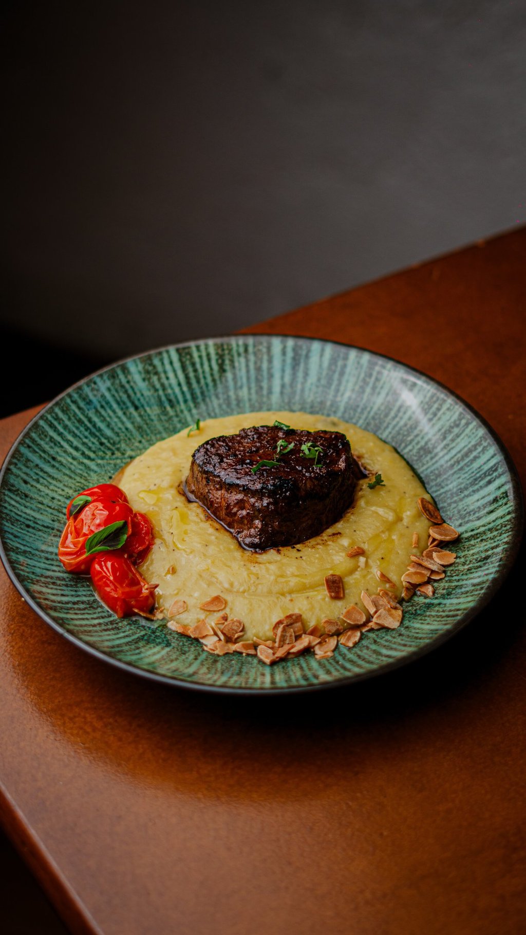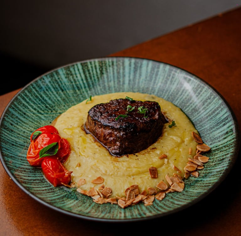 Filé mignon alto, purê de banana-da-terra c/ gengibre, tomates confit e lâminas de amêndoas tostadas.