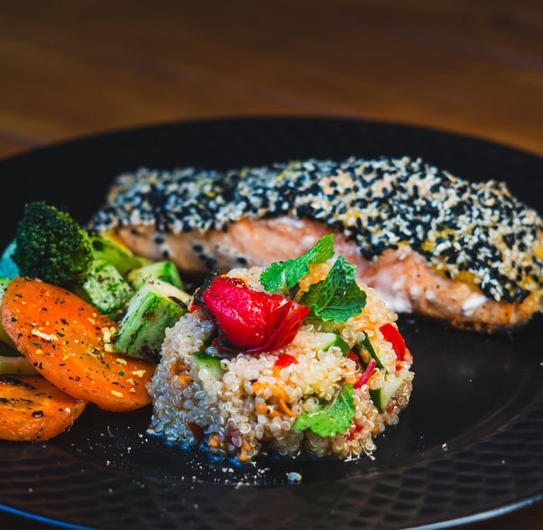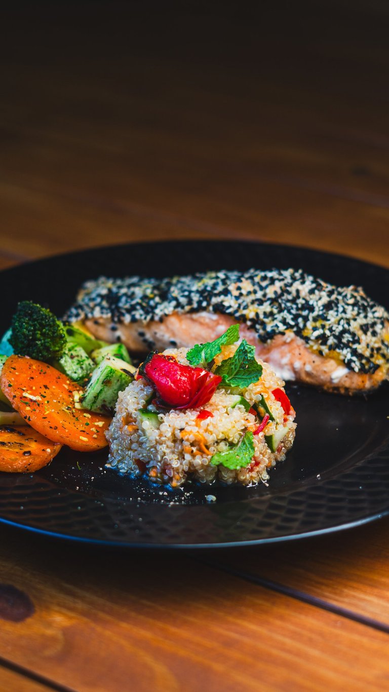 Salmão em crosta de gergilim, salada refrescante de quinoa e legumes salteados.